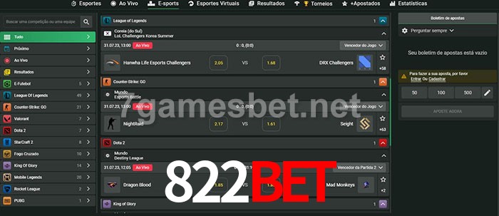O 822Bet oferece uma grande seleção de opções de apostas em e-sports com probabilidades competitivas